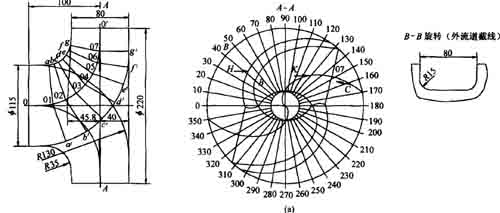 包角φ大,則有利于葉輪與液體之間的能量轉(zhuǎn)換。為了保證該泵在全揚(yáng)程范圍內(nèi)具有無(wú)過載功率特性,且具有較平坦的功率曲線,應(yīng)取較大的流道包角。通常乒為100°-250°,比轉(zhuǎn)數(shù)大時(shí)取小值,比轉(zhuǎn)數(shù)小時(shí)取大值。本設(shè)計(jì)取φ=170°,并采用等變角對(duì)數(shù)螺旋線來繪制葉輪平面圖的流道中線。