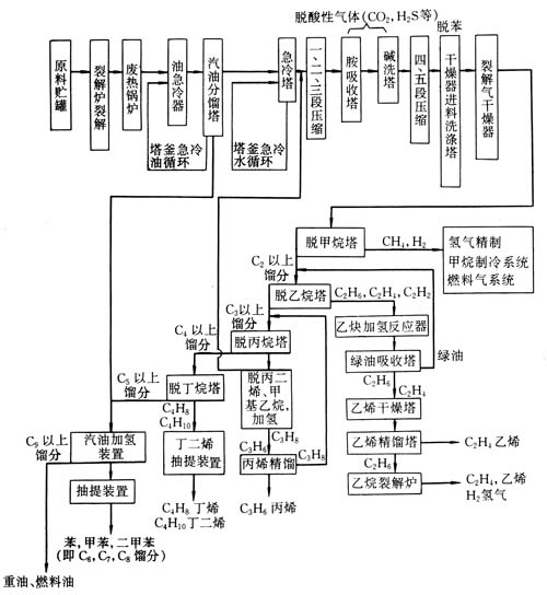我國揚子三十萬噸乙烯裝置的工藝流程主要包括裂解、油急冷、汽油分餾、水急冷、裂解氣壓縮、脫酸性氣體、裂解氣再壓縮、脫苯、干燥、脫甲烷、乙烯精餾、脫丙烷、丙烯精餾、脫丁烯、丁二烯抽提、汽油加氫等工序。其工藝流程框圖見圖2—132。
