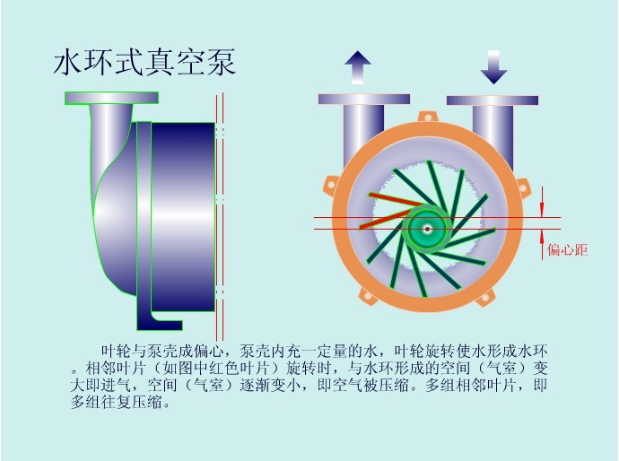 水環(huán)式真空泵圓柱形泵缸內(nèi)注入一定量的水,星形葉輪偏心地裝在泵缸內(nèi),當(dāng)葉輪旋轉(zhuǎn)時(shí),水受離心力作用被甩向四周而形成一個(gè)相對(duì)于葉輪為偏心的封閉水環(huán)。