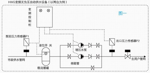 無負(fù)壓變頻供水設(shè)備 由變頻控制系統(tǒng)、無負(fù)壓穩(wěn)流罐、壓力傳感系統(tǒng)、負(fù)壓抑制系統(tǒng)、水泵、配套附件等組成,設(shè)備過流部分采用不銹鋼304材質(zhì)。罐式無負(fù)壓變頻供水設(shè)備 通過微機(jī)設(shè)定用戶所需的供水壓力,當(dāng)用戶的用水量增加,微機(jī)檢測(cè)到自來水的壓力低于用戶所需的用水壓力時(shí),微機(jī)會(huì)自動(dòng)控制變頻器啟動(dòng),管網(wǎng)壓力調(diào)節(jié)系統(tǒng)工作,直到使管網(wǎng)壓力增加到用戶所需的用水壓力時(shí),微機(jī)控制變頻器輸出一恒定的頻率,管網(wǎng)壓力調(diào)節(jié)系統(tǒng)以一恒定的壓力運(yùn)行,保證用戶用水壓力恒定。當(dāng)用戶的用水量減少,自來水的壓力逐漸恢復(fù)到用戶所需的用水壓力,微機(jī)控制變頻器輸出的頻率逐漸降低直至增壓泵停止運(yùn)行,系統(tǒng)充分利用了自來水原有的壓力,又保證了用戶供水壓力的穩(wěn)定。