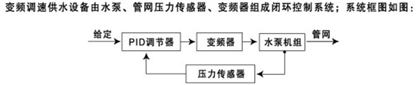 變頻恒壓供水設(shè)備由水泵、管網(wǎng)壓力傳感器、變頻器組成閉環(huán)控制系統(tǒng);系統(tǒng)框圖: